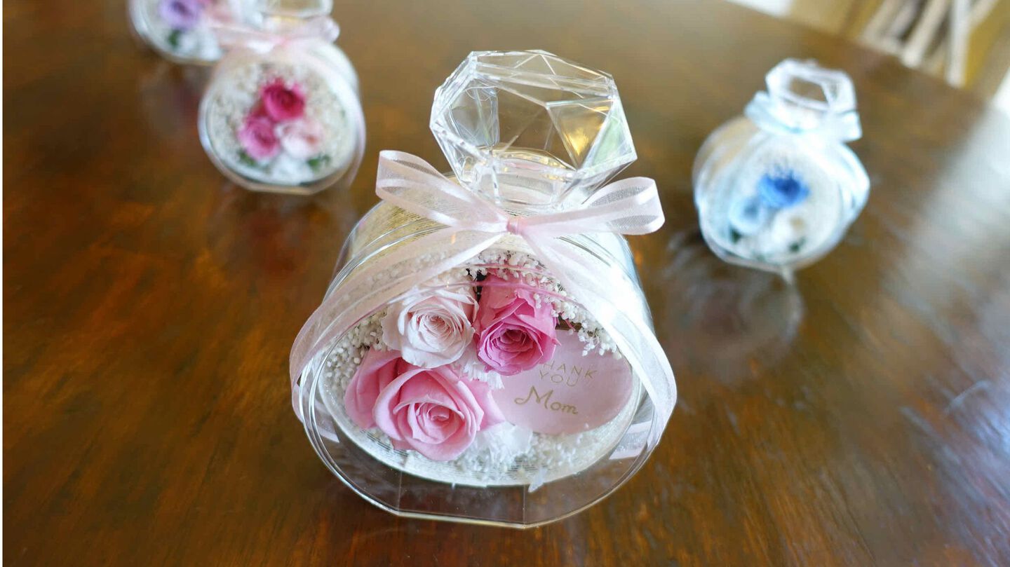母の日限定メッセージ入り香水ボトル。豪華でありながら優しいイメージのアレンジメントは