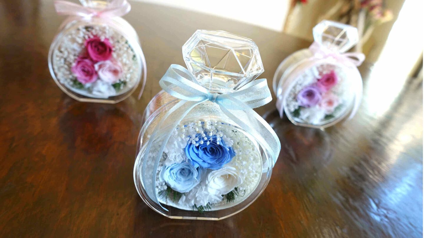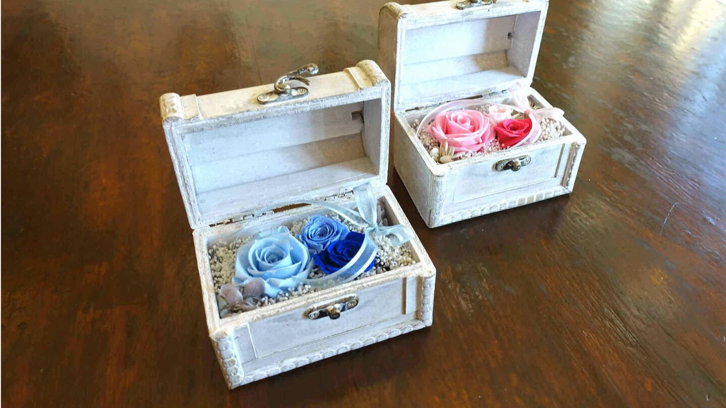 アンティーク調の宝箱に花びらをアレンジ。ブルーとピンクの2色あり。宝箱の数に限りがある為、完全数量限定商品。