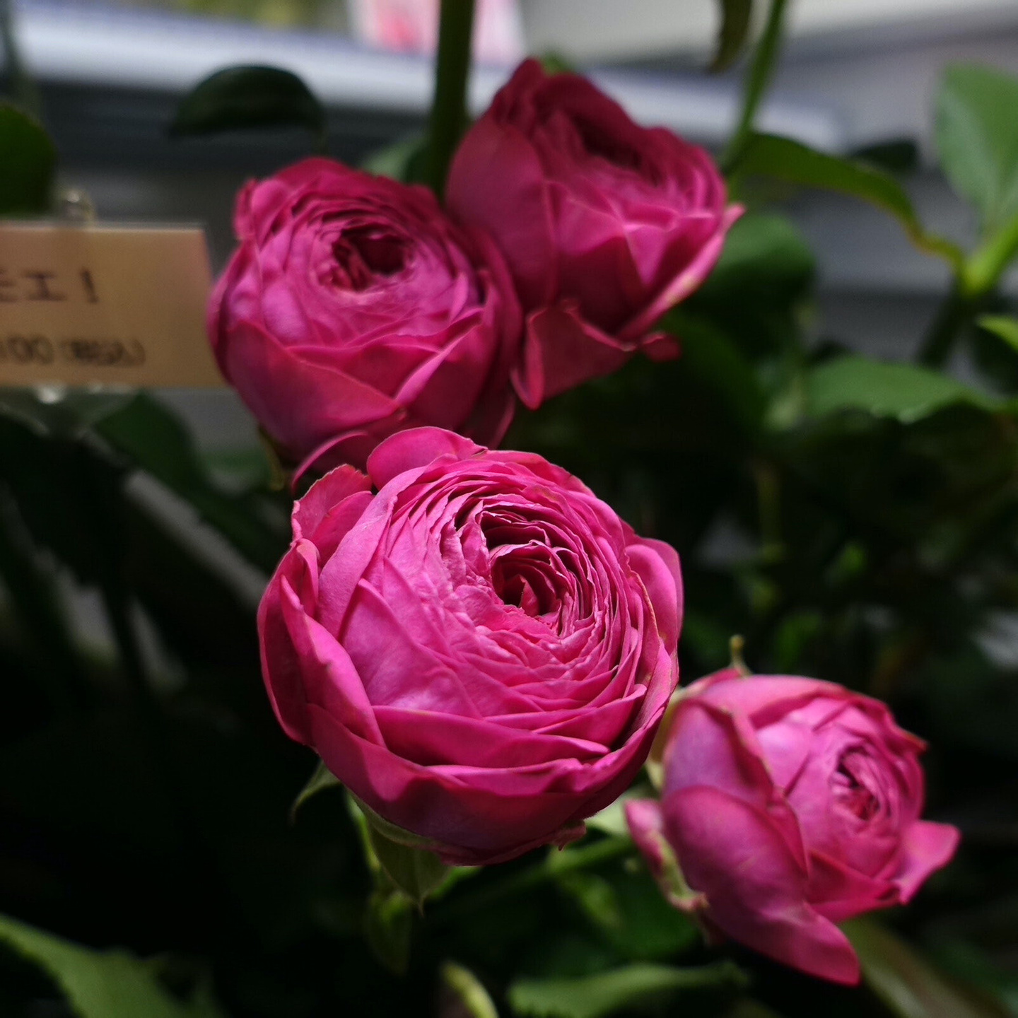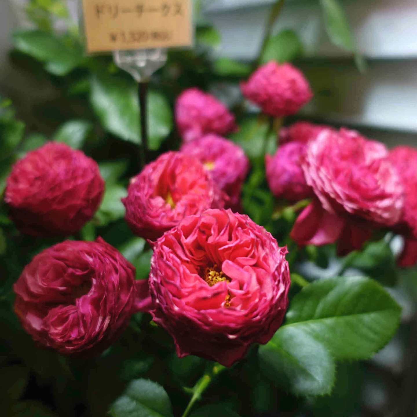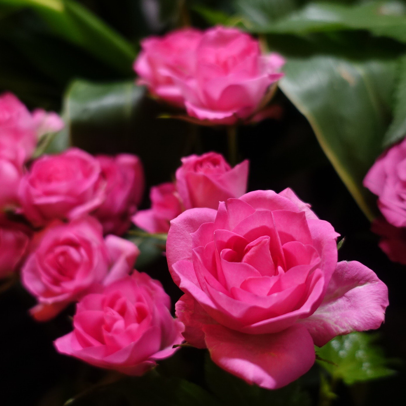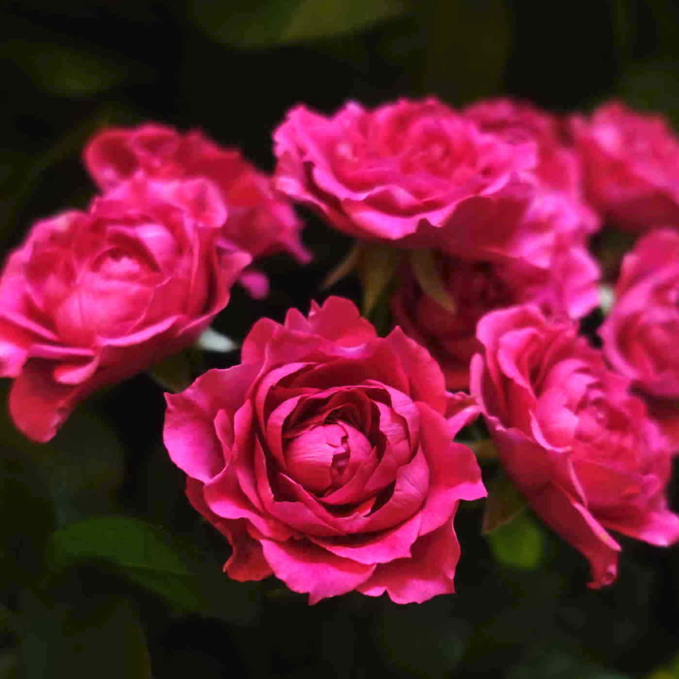 鮮やかな濃いピンク色。濃いスプレーバラの中ではもっとも大輪でボリュームがある。