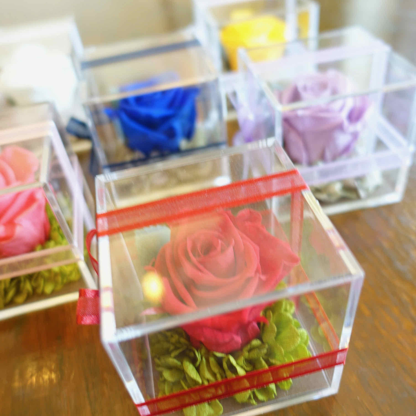 ガラスボトルに閉じ込めた大輪バラはプロポーズや記念日などに人気。全7色。