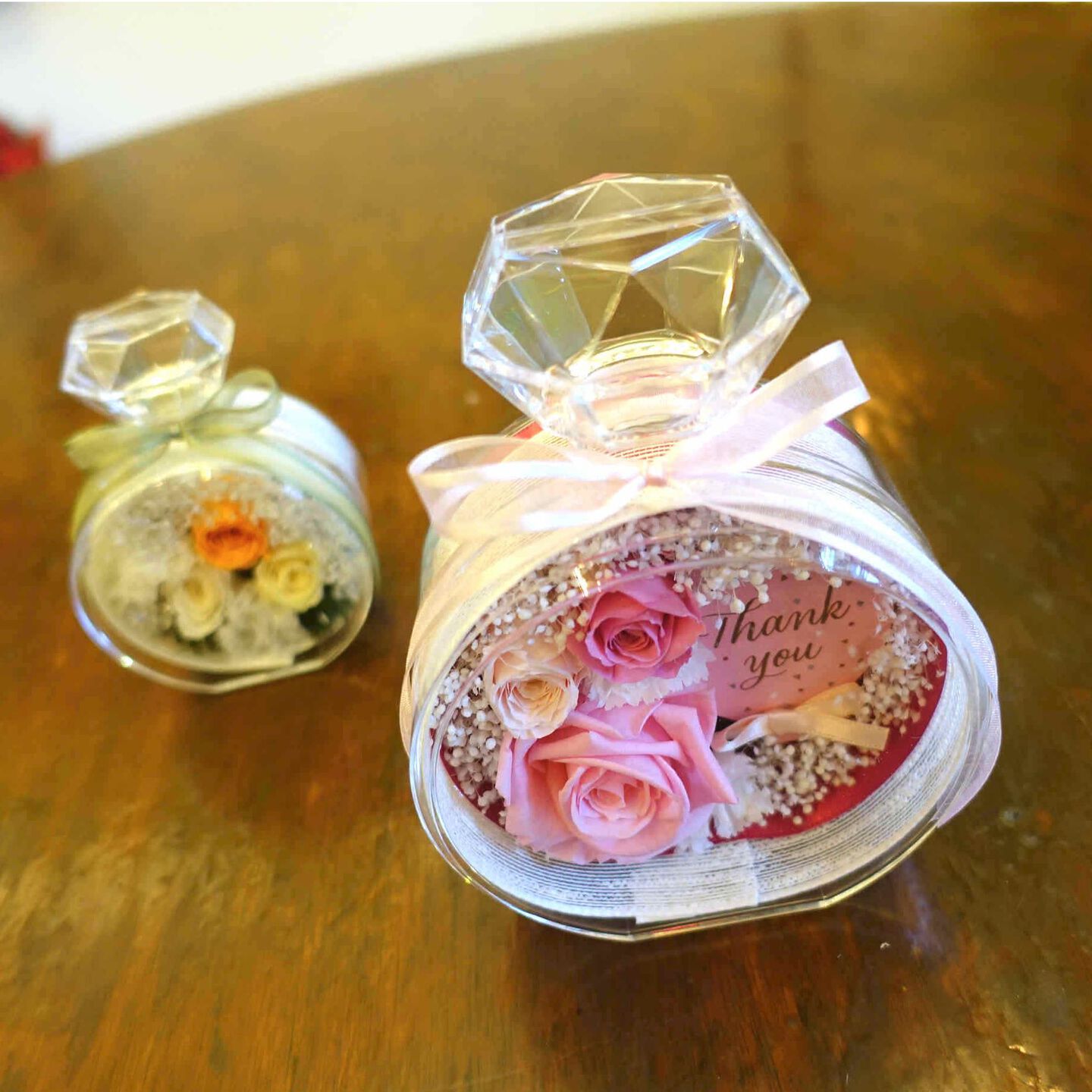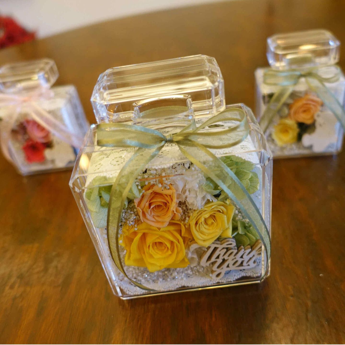 アクリル製の香水ボトルにピンクミックスのラブリーアレンジメント。イエローミックスのカラーバリエーションもあり。
