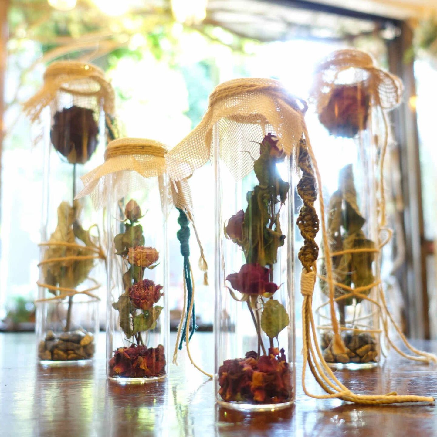 様々な品種のバラをグラスチューブにセットしました。季節によりお花が変わります。