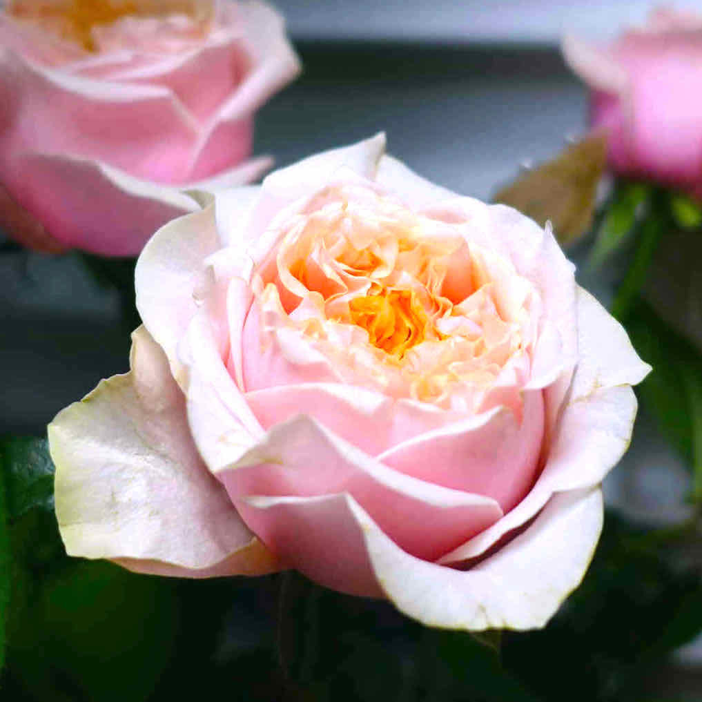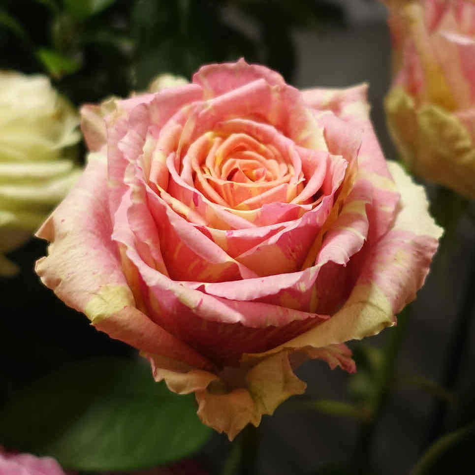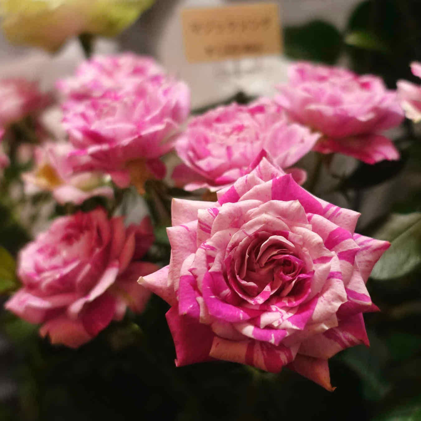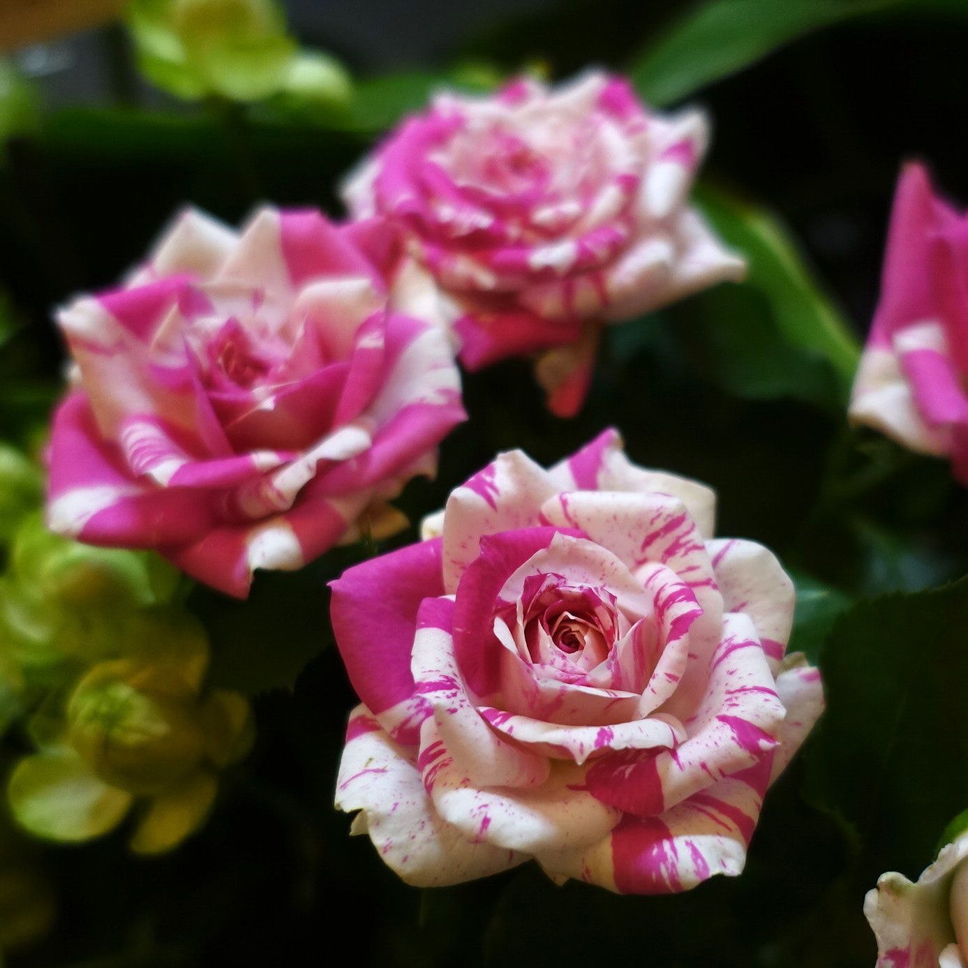 ピンク地の白絞り。名前のように花びらがくるくる回っているようなバラ。