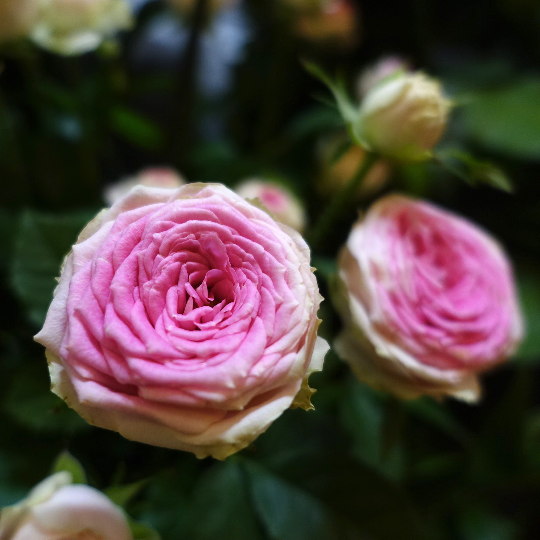 つぼみは白、開くと中心がピンク色。コロンと可愛らしい花姿。ボリュームあり。