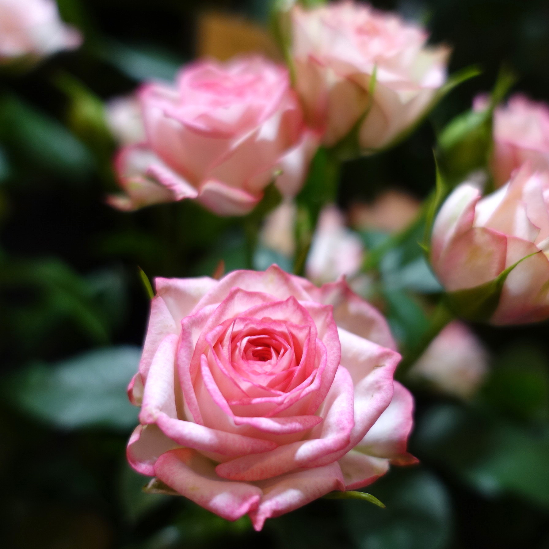 白とピンクのグラデーション。高温期でも花の大きさがほとんど変わらない品種。ボリュームもあり、日持ちも良い。