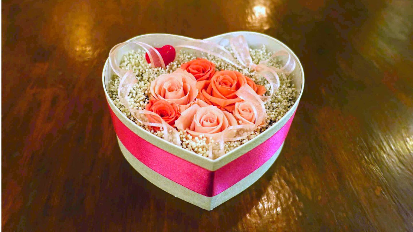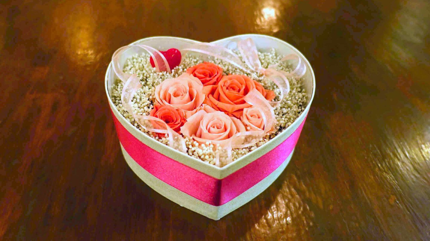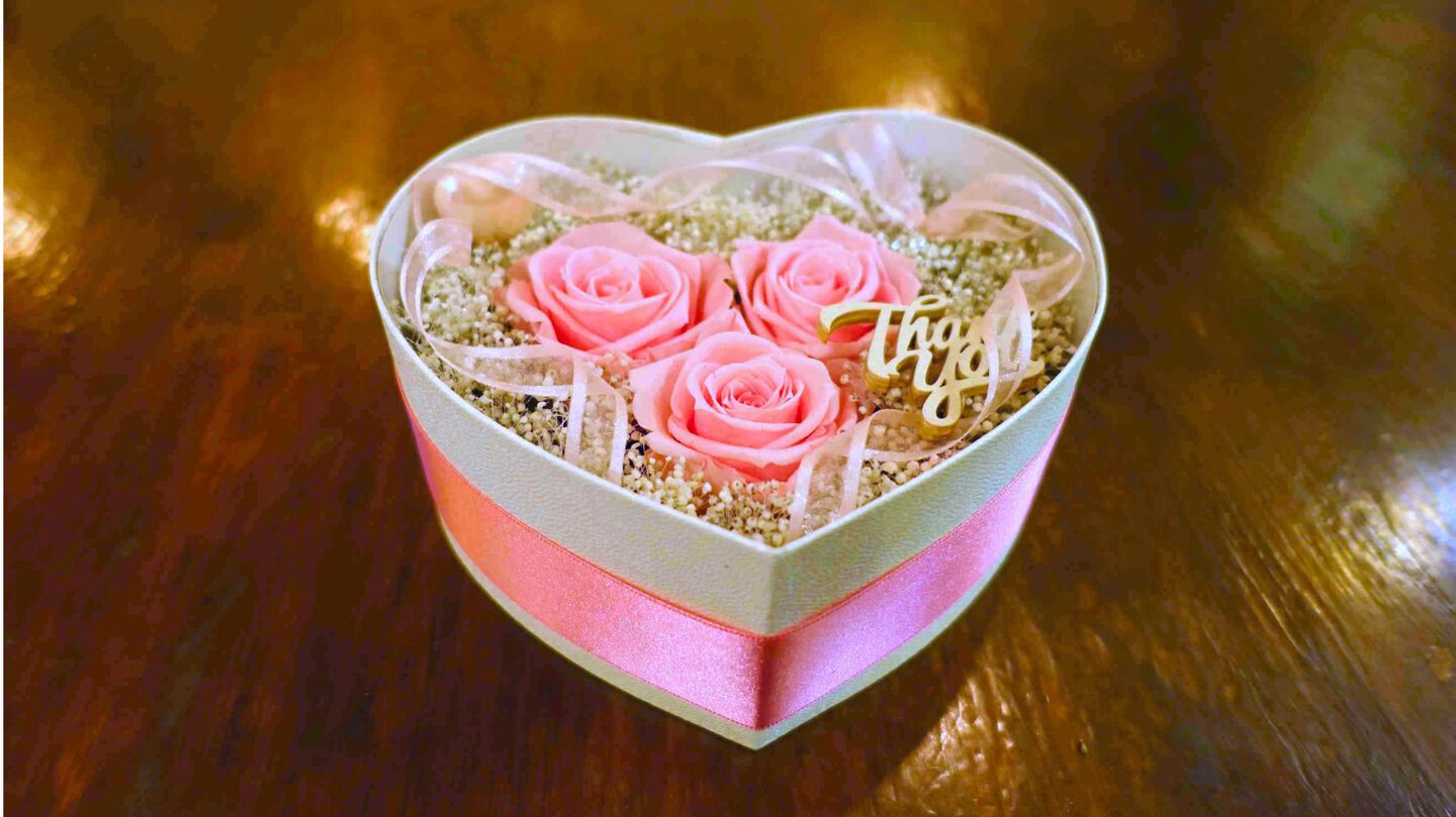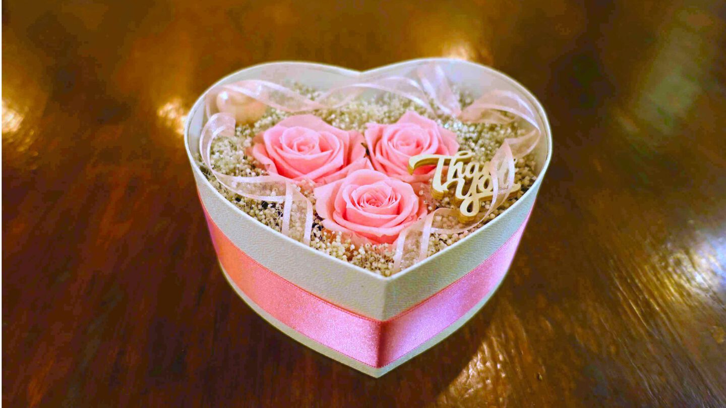 ハート型のボックスに大輪バラ。優しいピンクが可愛らしいボックスアレンジメントです。この時期だけの限定商品。