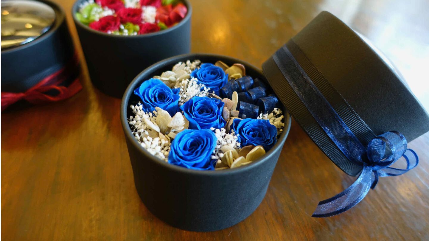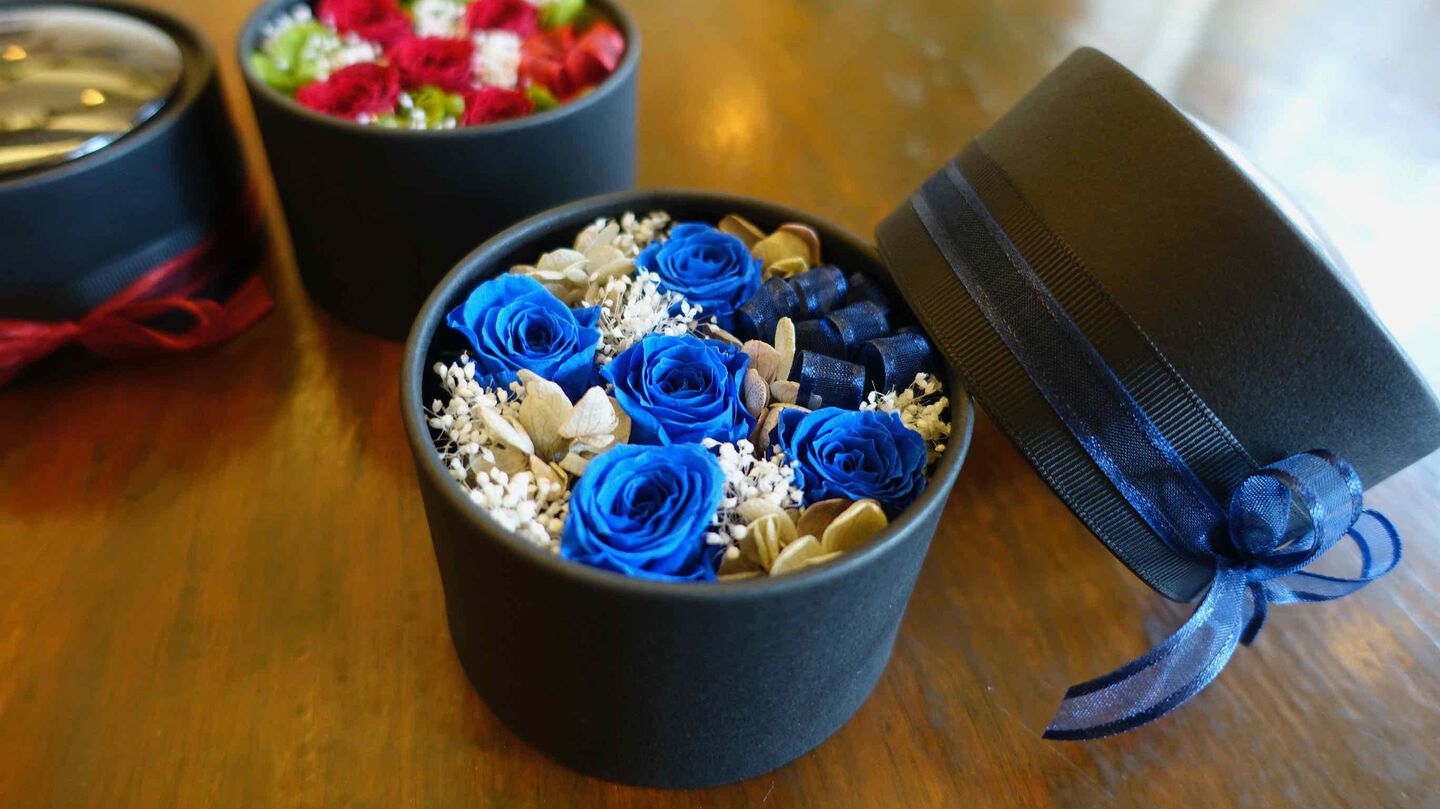 アンティーク調の宝箱に花びらをアレンジ。ブルーとピンクの2色あり。宝箱の数に限りがある為、完全数量限定商品。