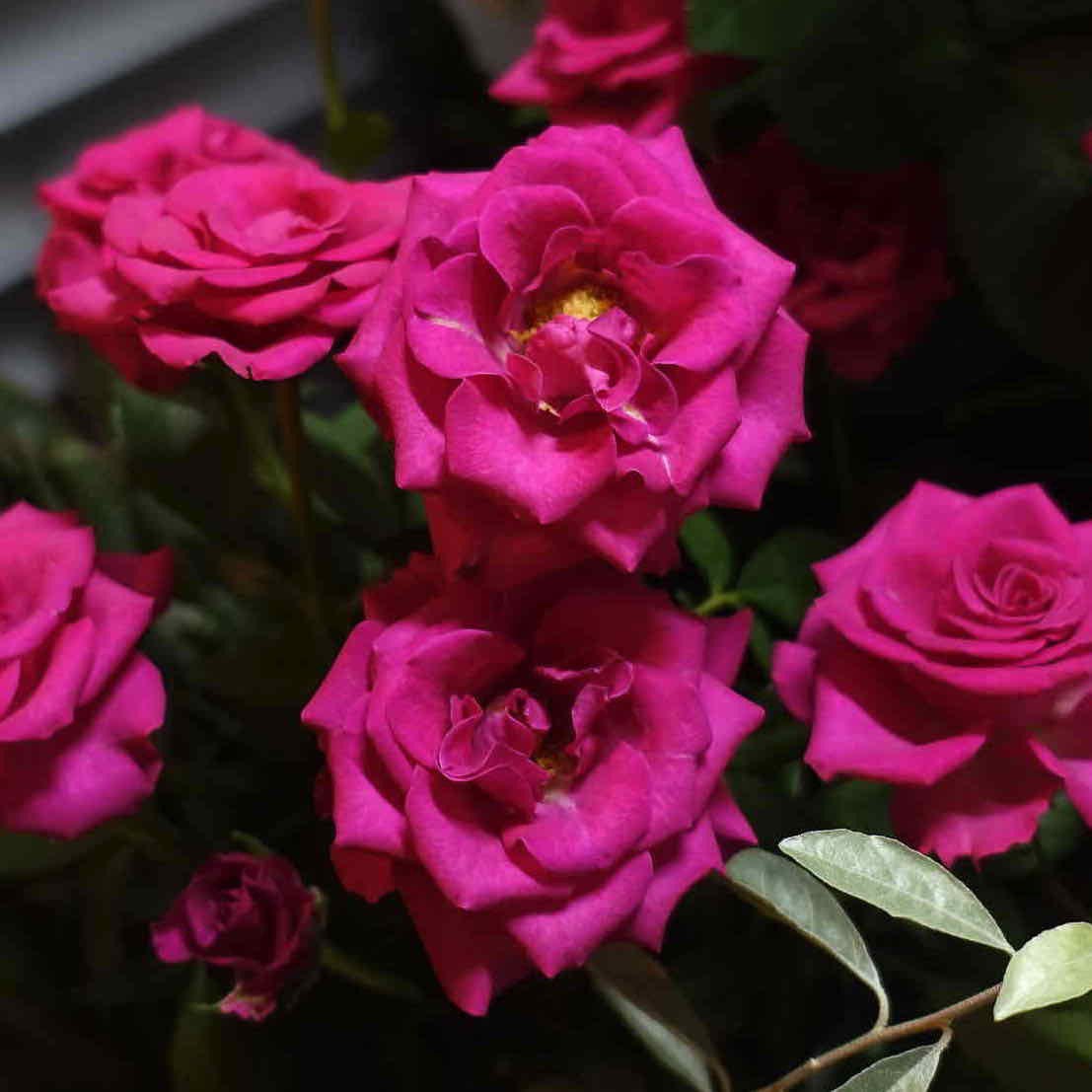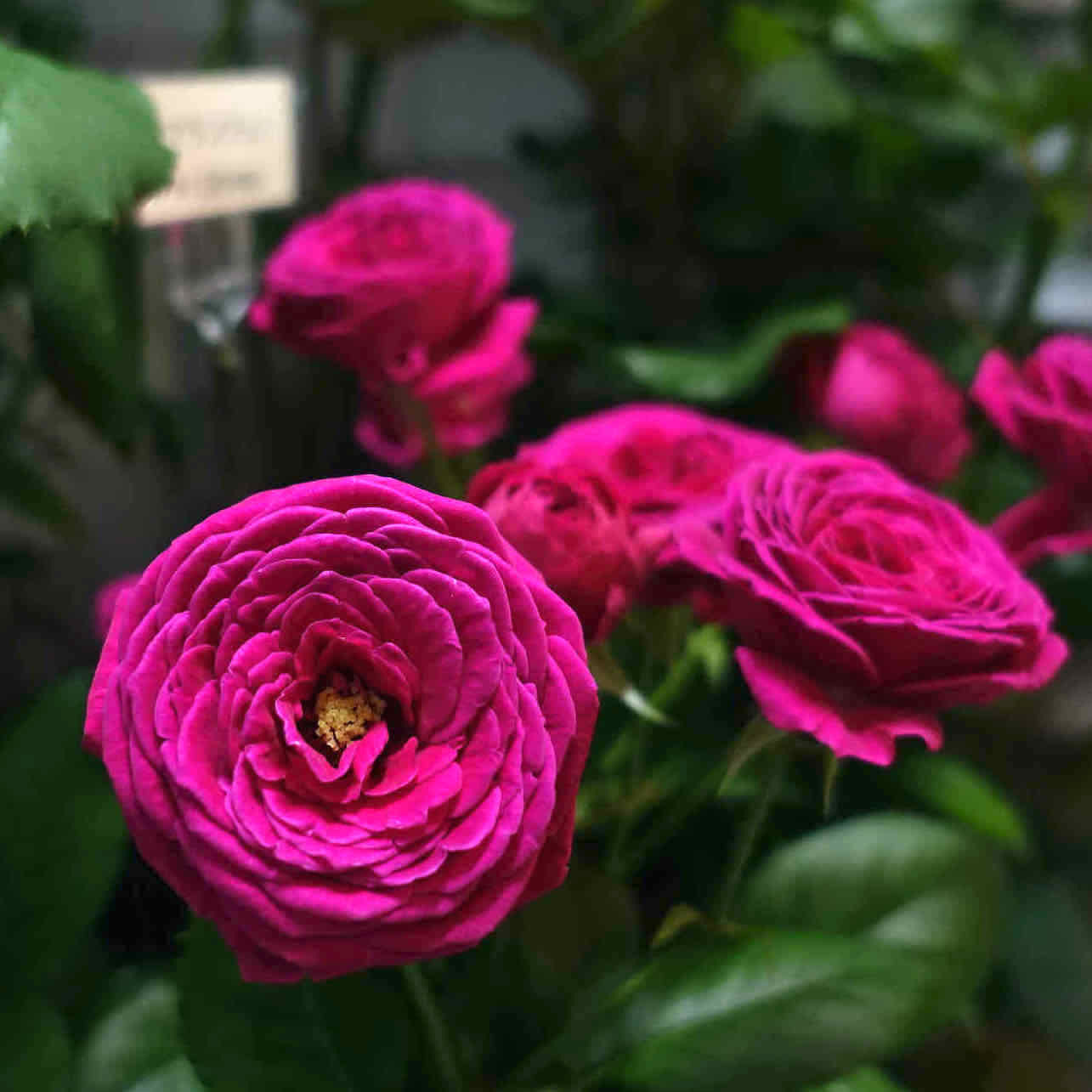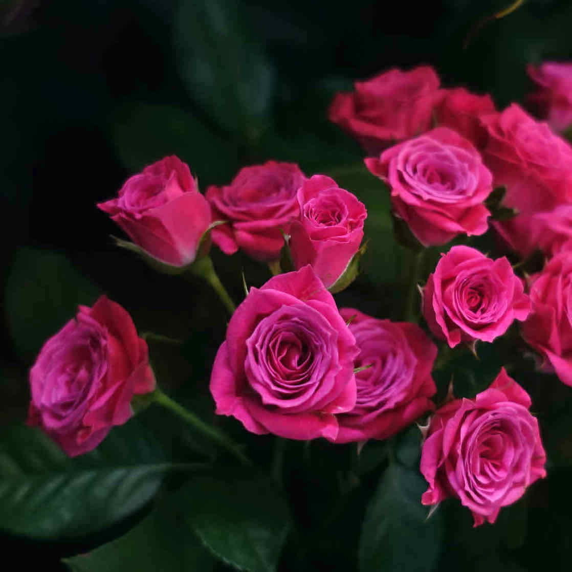 鮮やかな濃いピンク色。濃いスプレーバラの中ではもっとも大輪でボリュームがある。