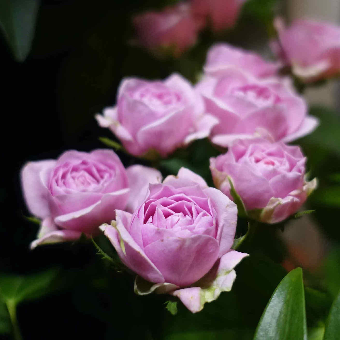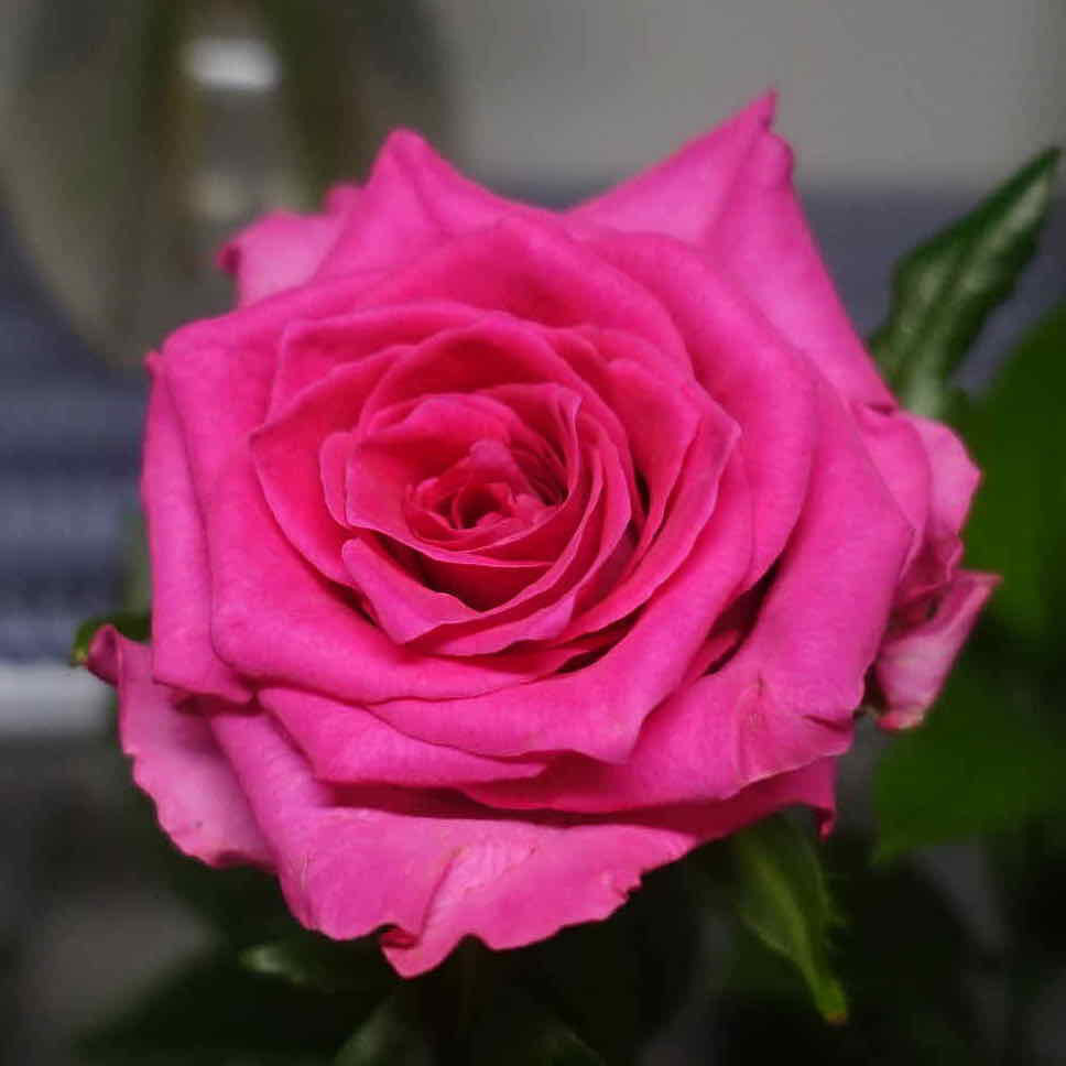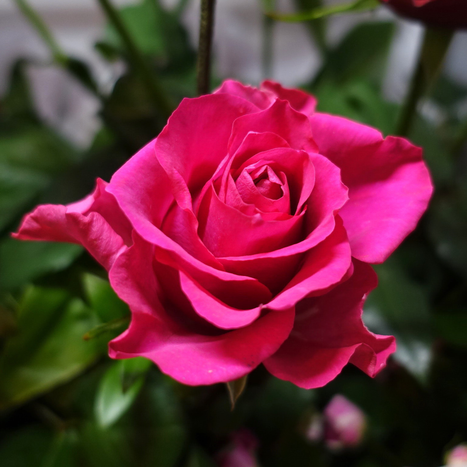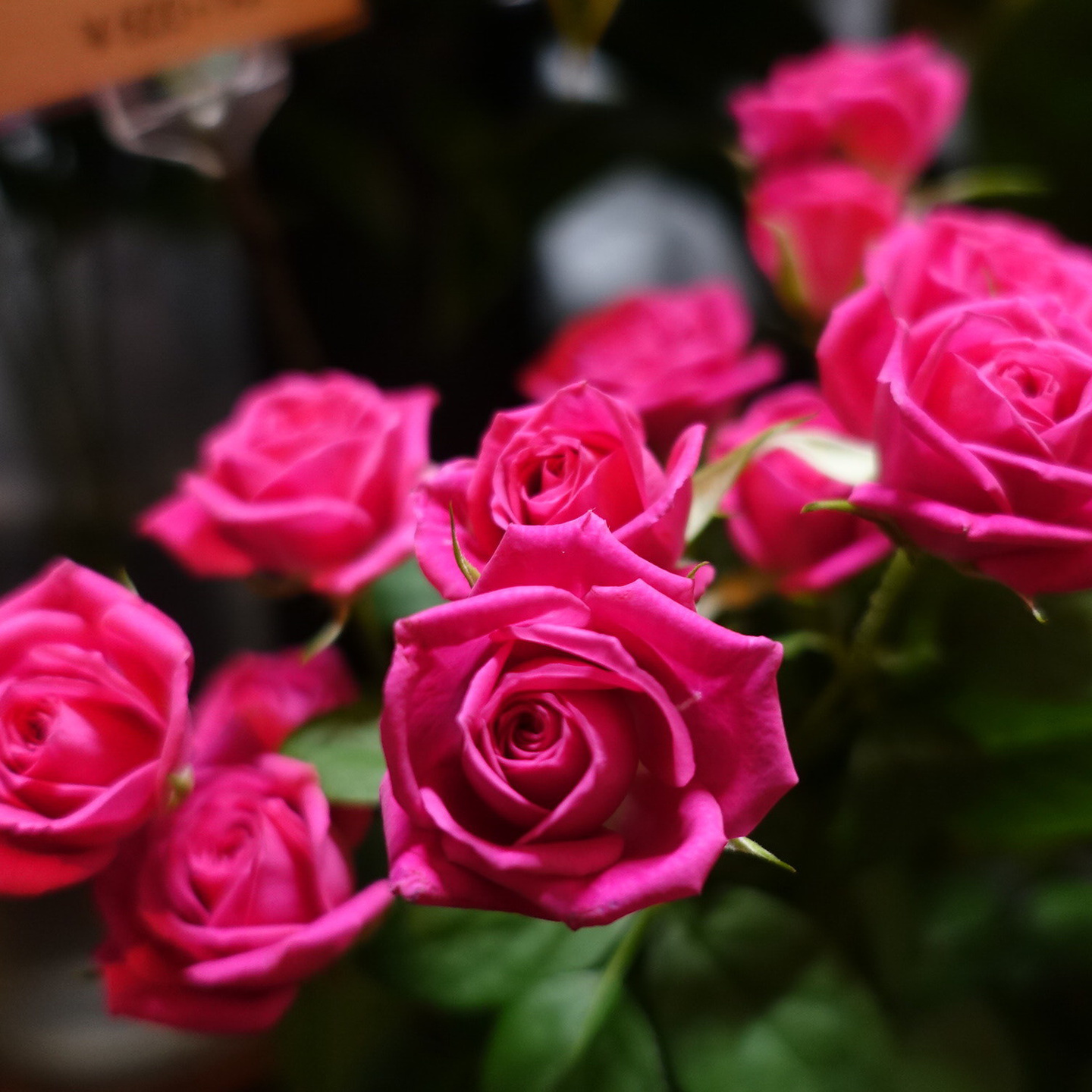 鮮やかな濃いピンク色。濃いスプレーバラの中ではもっとも大輪でボリュームがある。