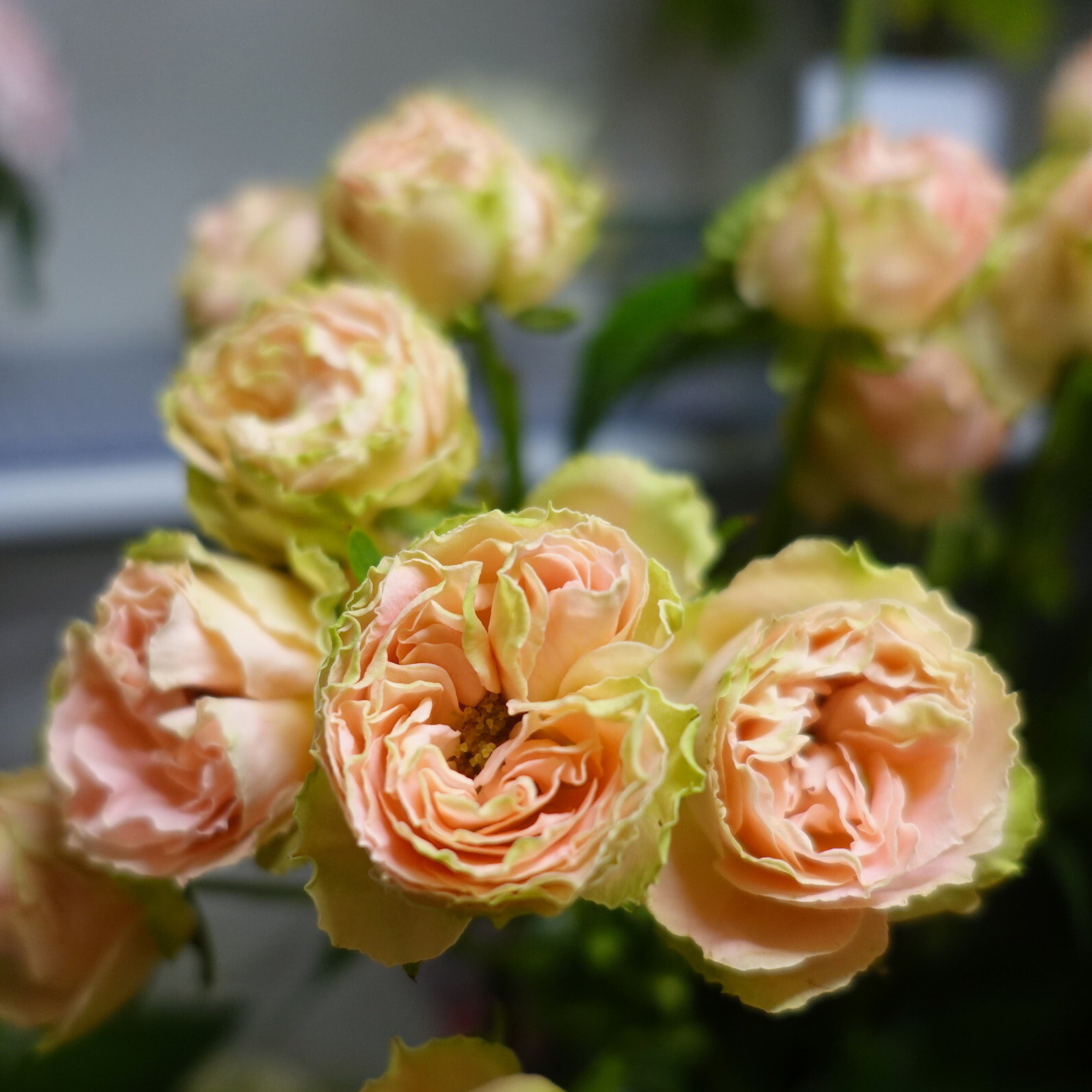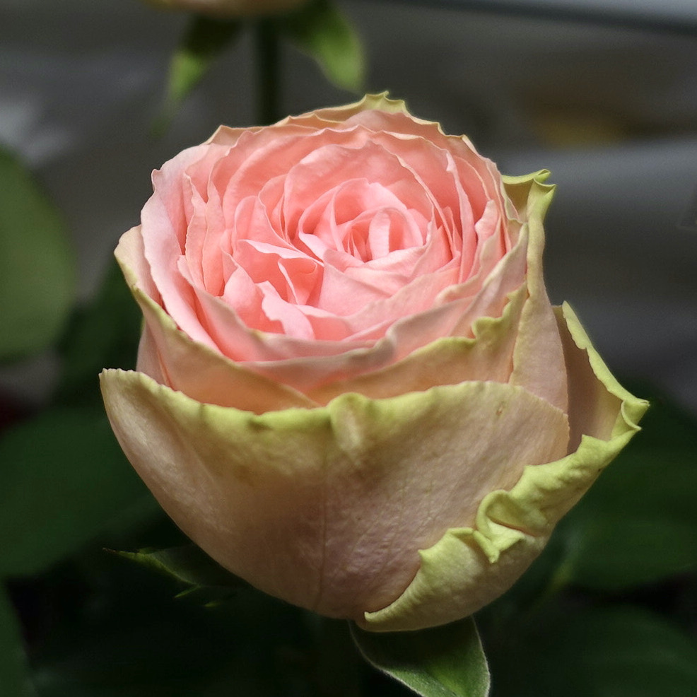 花びらの外側はグリーン、中心は乙女系ベビーピンク。フリルがかったアンティーク調の花びらが可愛らしい。