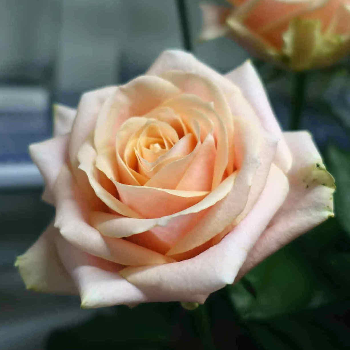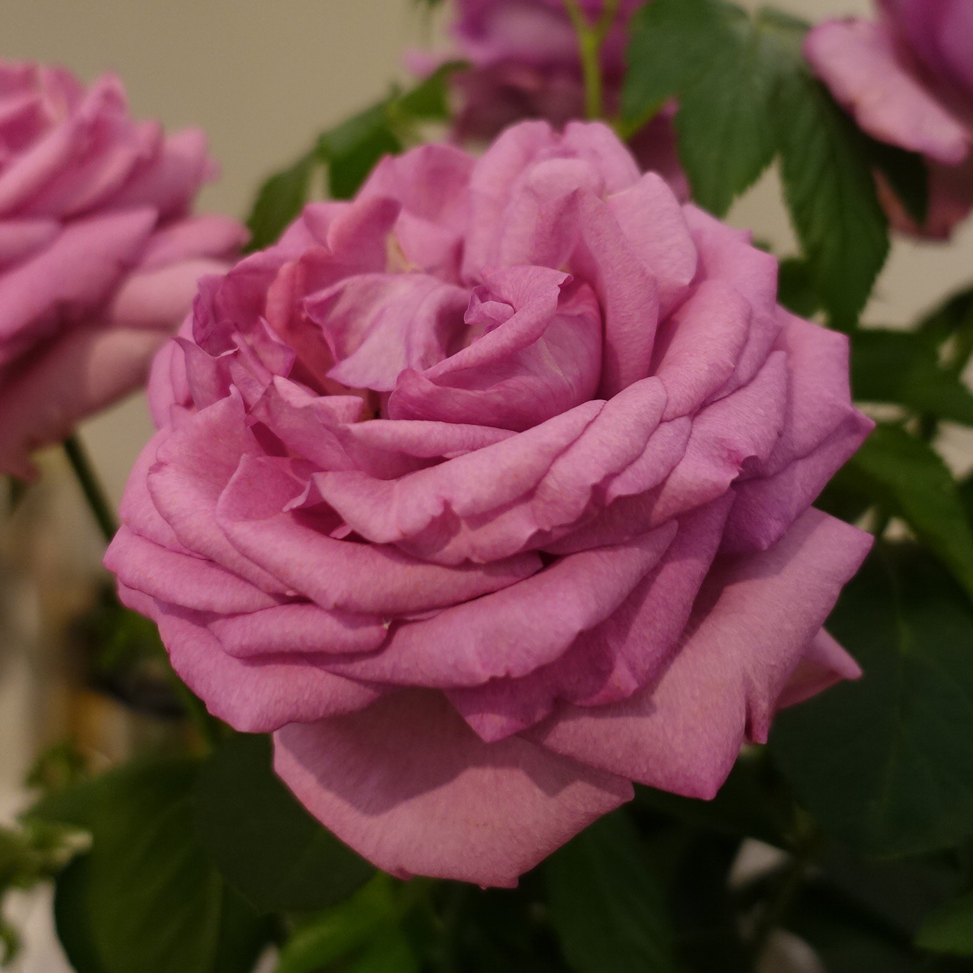 ピンクベージュのニュアンスカラー。幾重にも重なる花びらは重厚感と華やかさを併せ持つ。ティー系の香りあり。生産者の少ない希少品種。