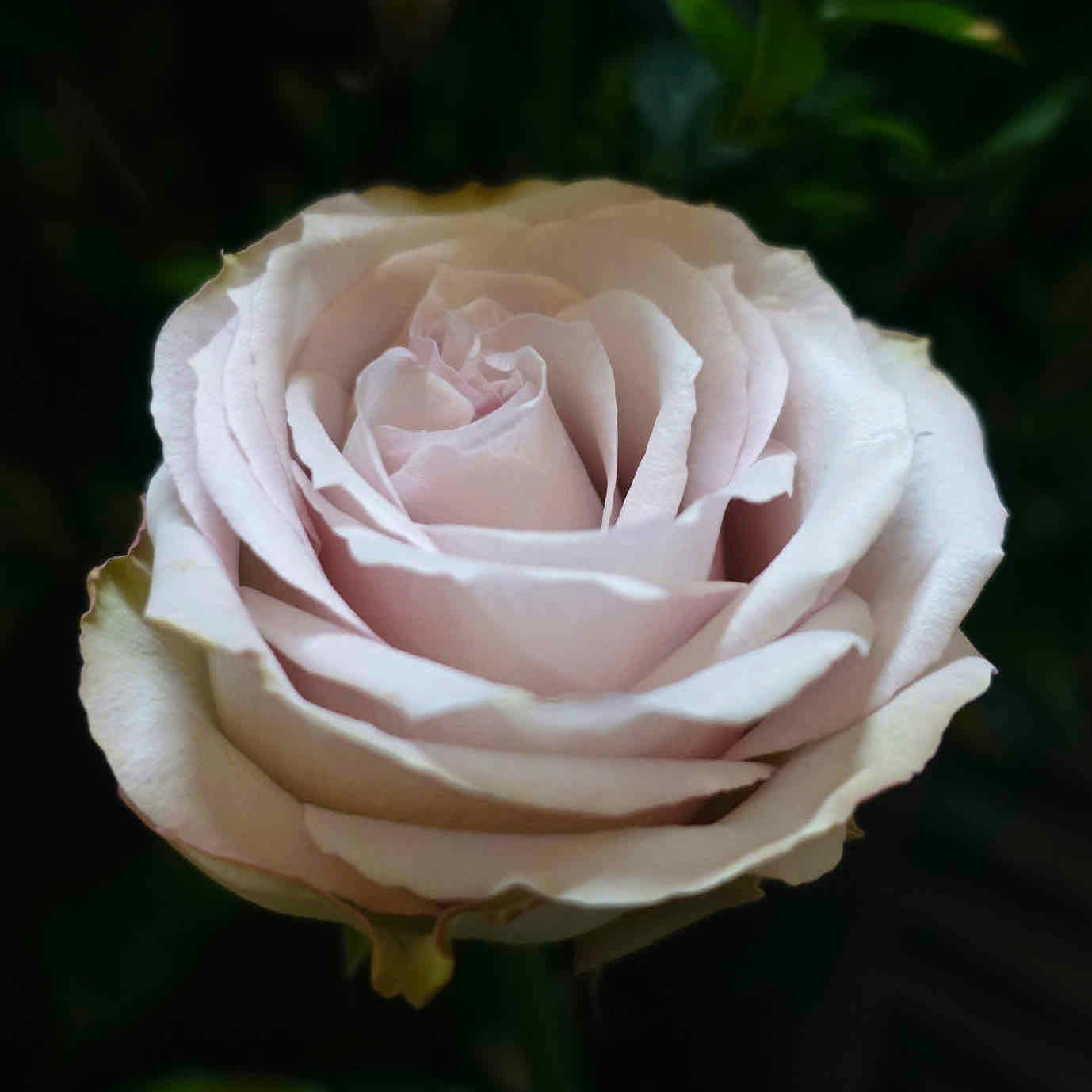 淡いラベンダーピンク色。花びらの縁がライラックピンクで彩られ、アンティークな風合い。