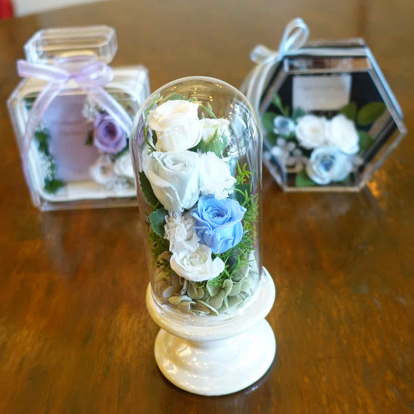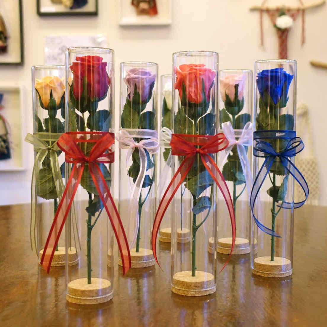 ガラスボトルに閉じ込めた大輪バラはプロポーズや記念日などに人気。全7色。