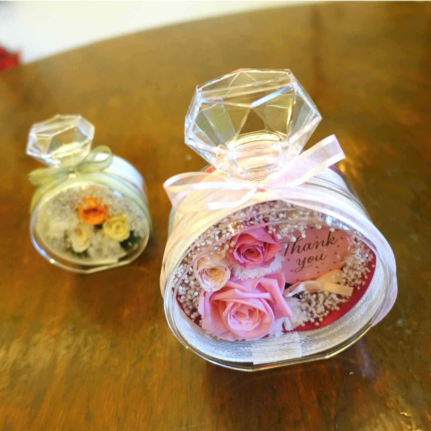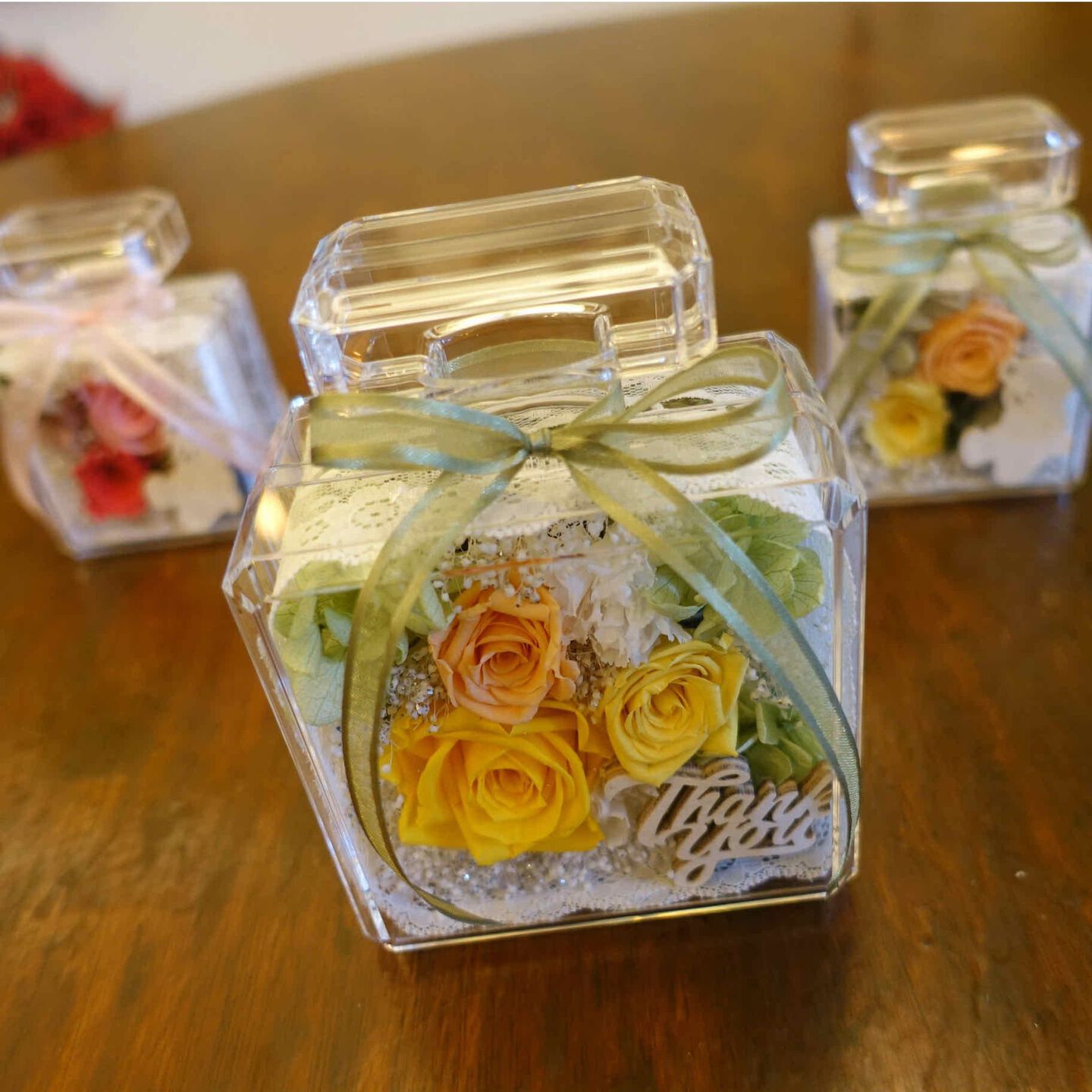 アクリル製の香水ボトルにピンクミックスのラブリーアレンジメント。イエローミックスのカラーバリエーションもあり。