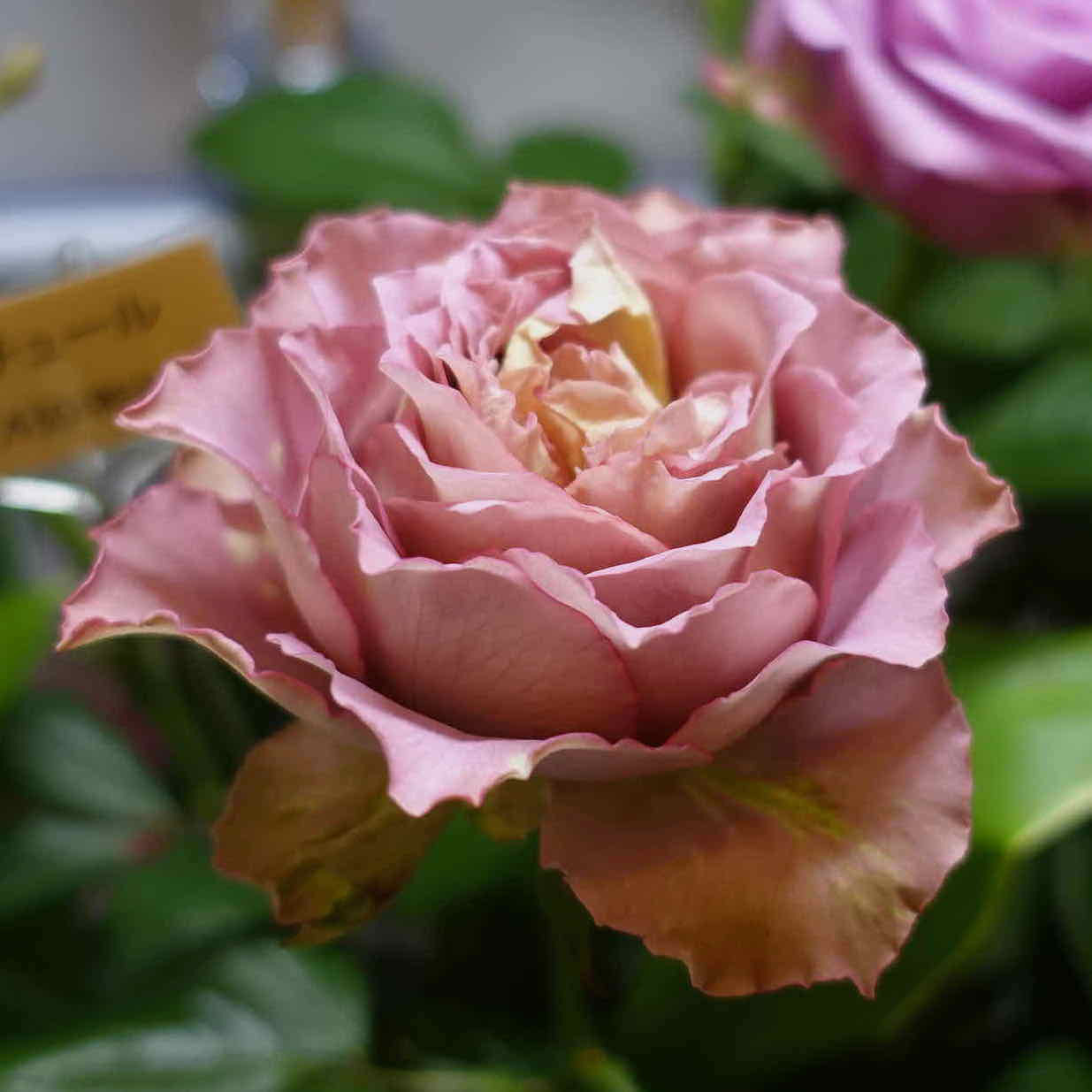 花びらの外側にブラウンが入る、アンティーク系ライトパープル。フリルがかった花びらが大人の雰囲気。ほんのり香るティー系の香りあり。