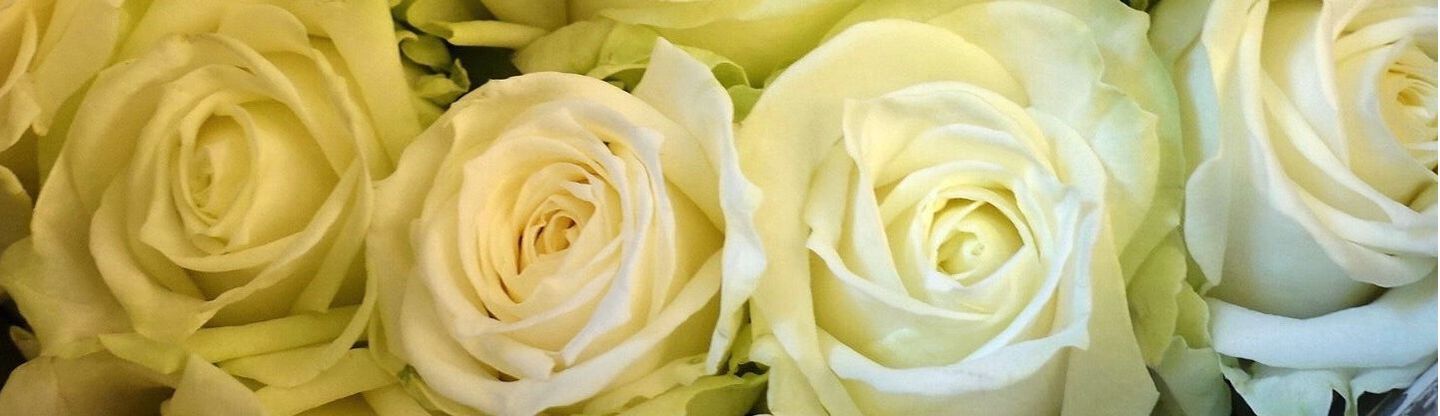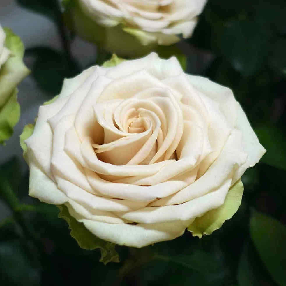 高級感のあるオフホワイト。巻きの多い花びらは、外側にグリーンが混じる。