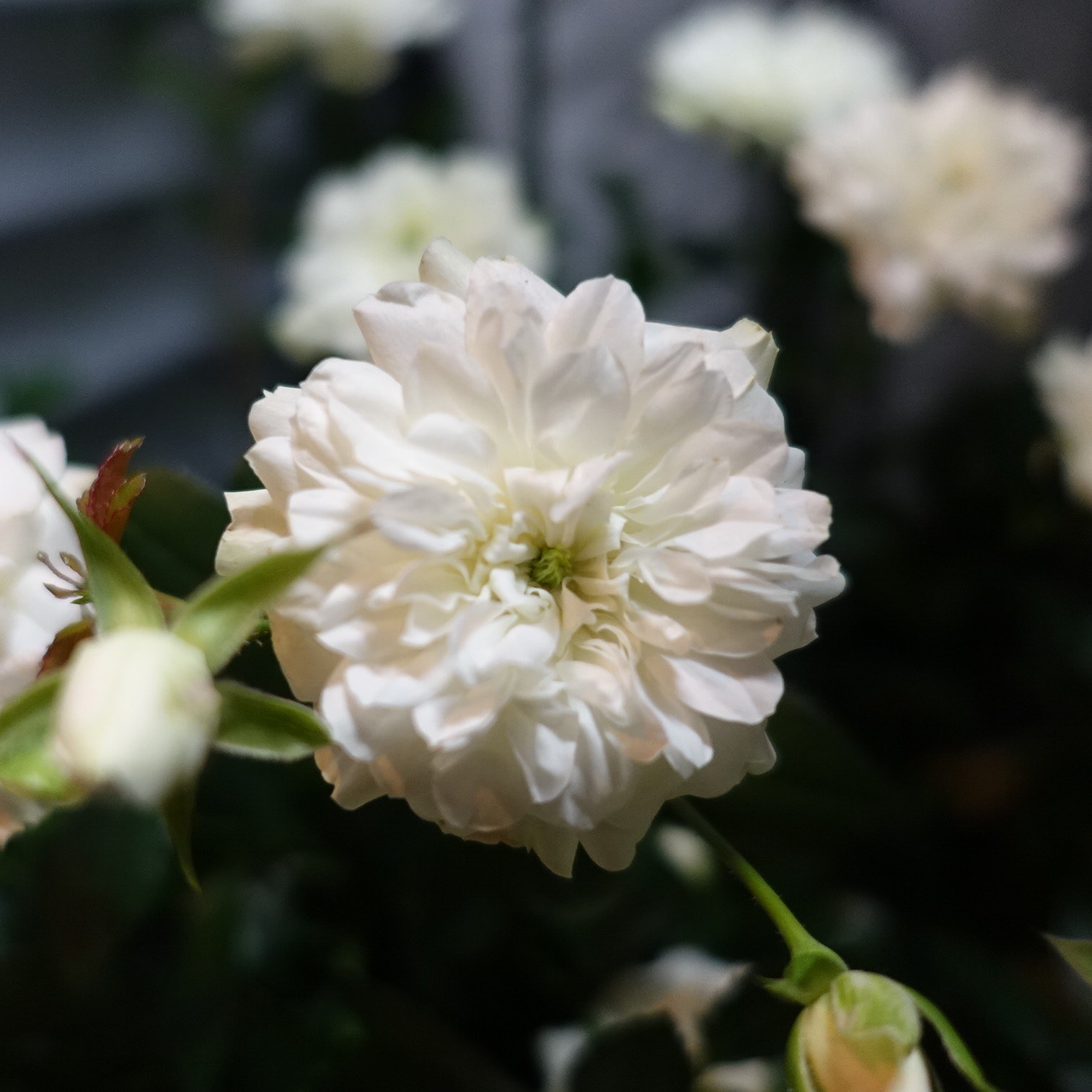 コロンと丸い花姿。グリーンがかっているつぼみは、開花すると純白に変化。