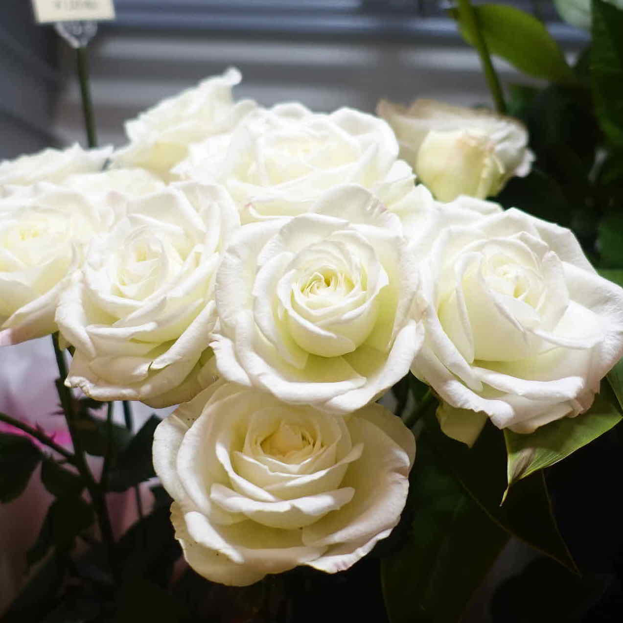 上品なホワイト、小ぶりで可愛らしい花姿は、大輪バラとも相性抜群。花束にお勧めしたいスプレーバラの定番。