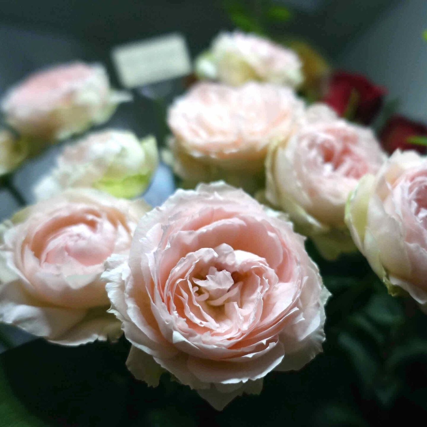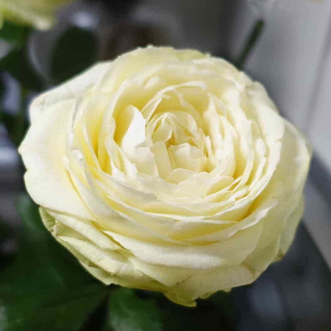 花びらの中心から外側に向かってクリーム〜ホワイトのグラデーション。ふちに淡いピンク色が混じる。スプレーバラにしては大きめのお花。