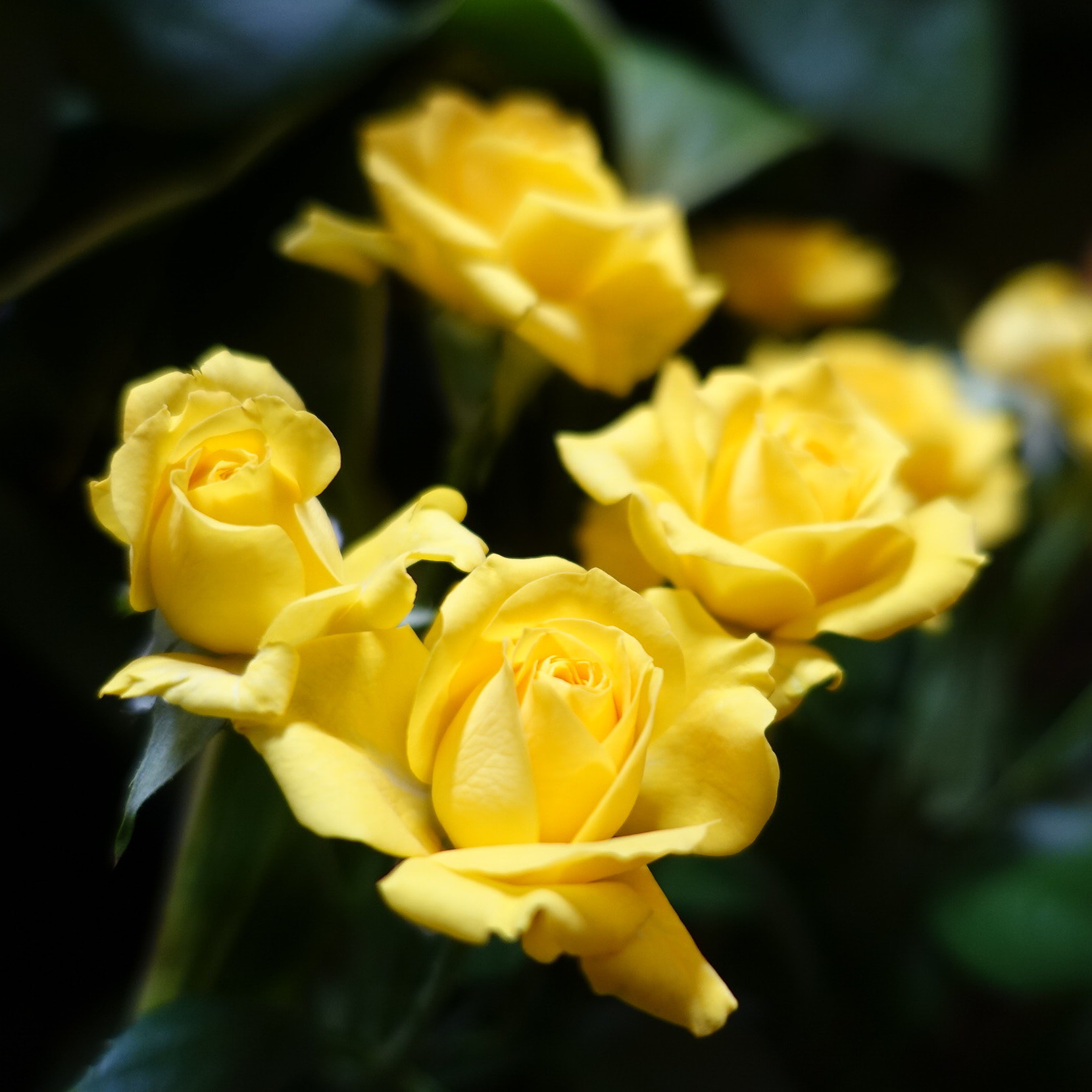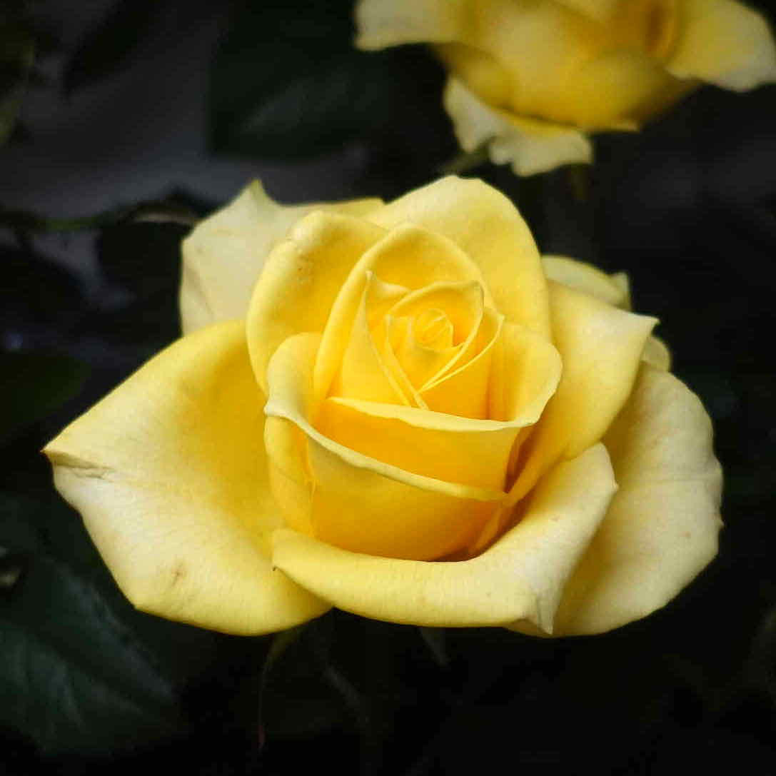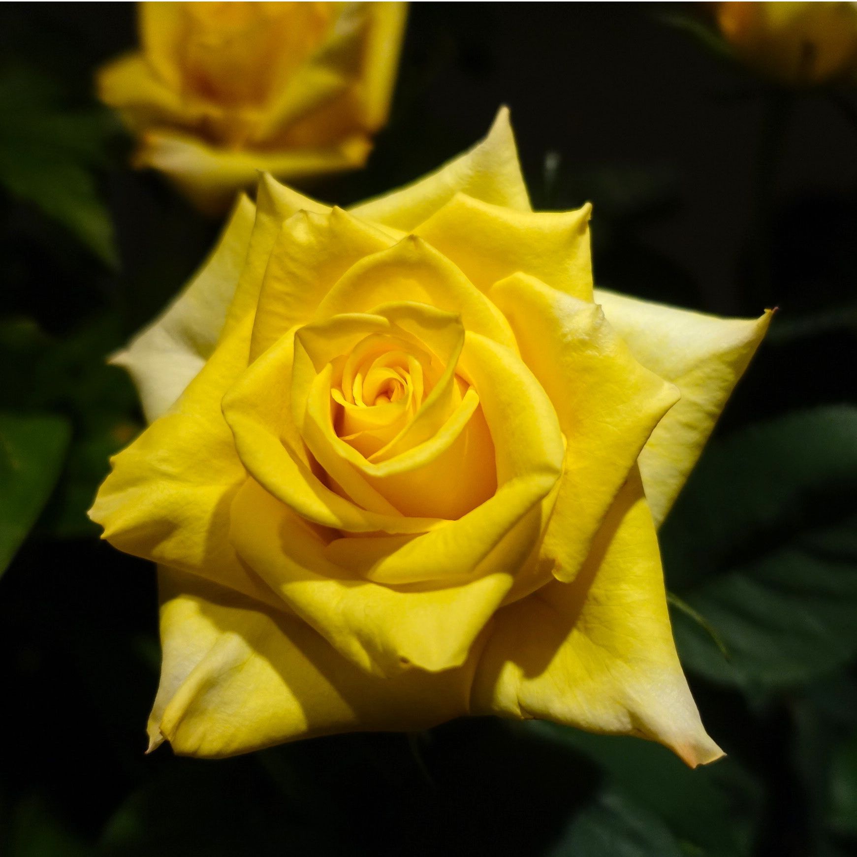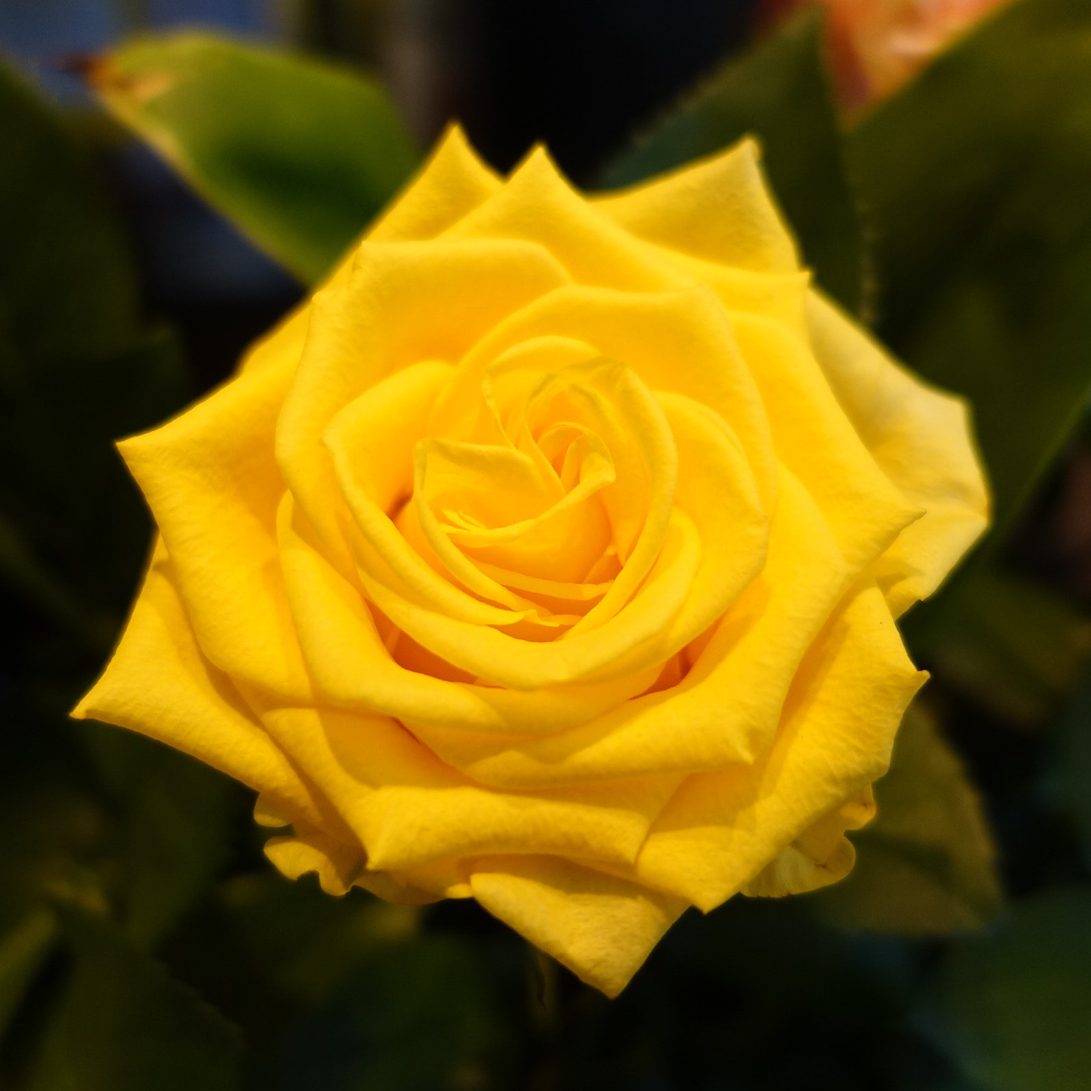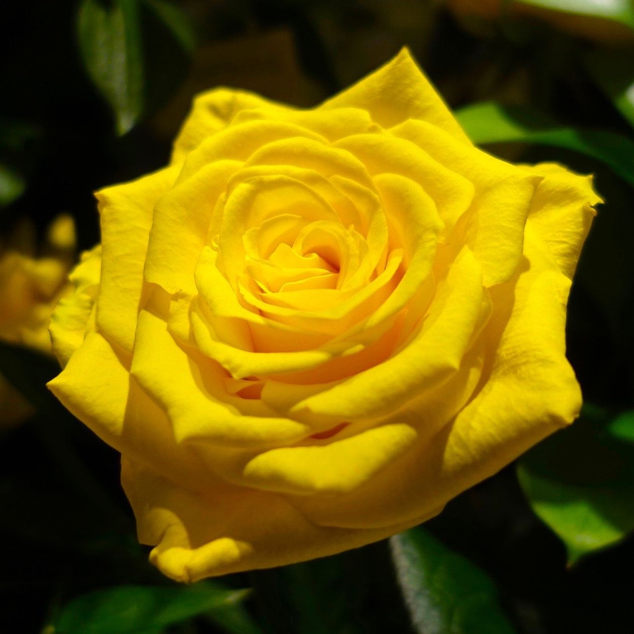 濃くて鮮やかな黄色。しっかりした巻きの花びらは、小ぶりながら存在感あり。