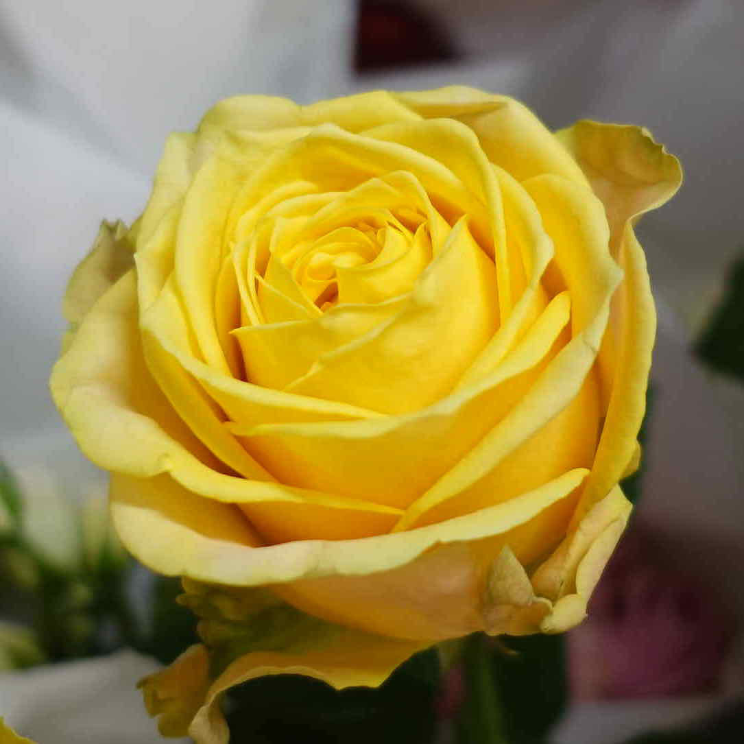 爽やかなレモンイエロー。花びらの中心が高く、外側に大きく開く高芯咲き。